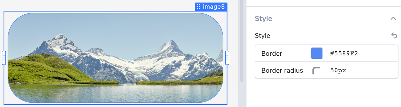 In **Properties** > **Style**, change border color and set **Border radius** in pixels or by percentage.