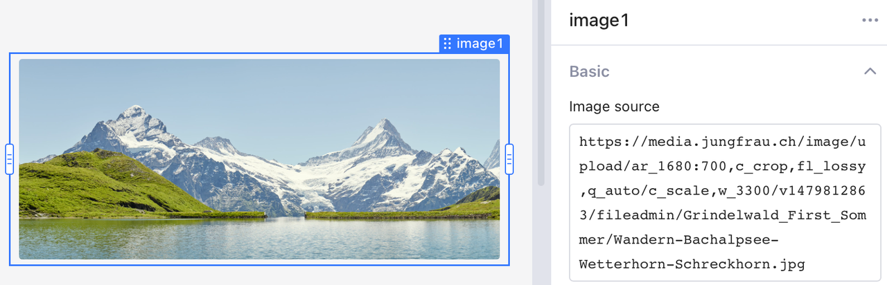 Drag the **Image** component onto the canvas or into a **Container**. Click the **Image** component, and the **Properties** tab is displayed on the right. You can set the URL to display an image.