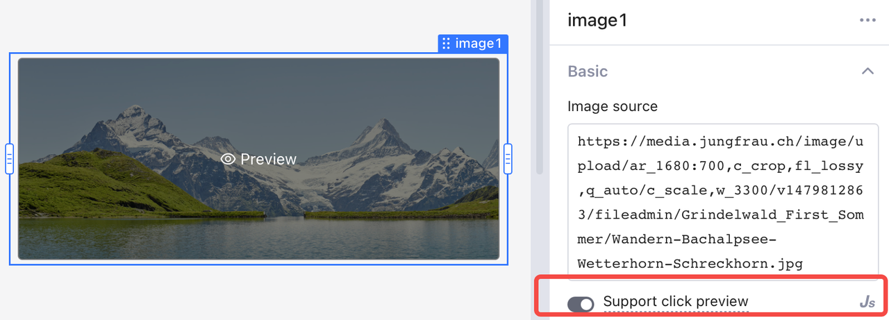 Ative **Suporte a visualização de clique** na guia **Propriedades** para permitir que os usuários visualizem a imagem em tamanho real. Passe o mouse sobre a imagem e você verá **👁 Visualização**. Então, você pode clicar para visualizar.