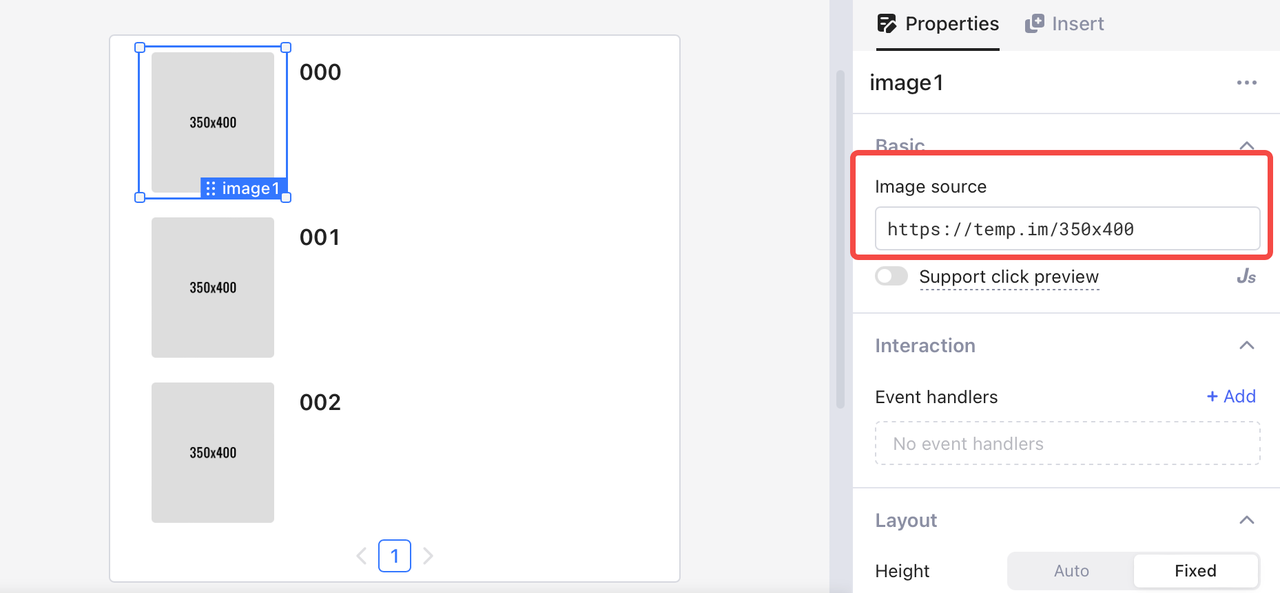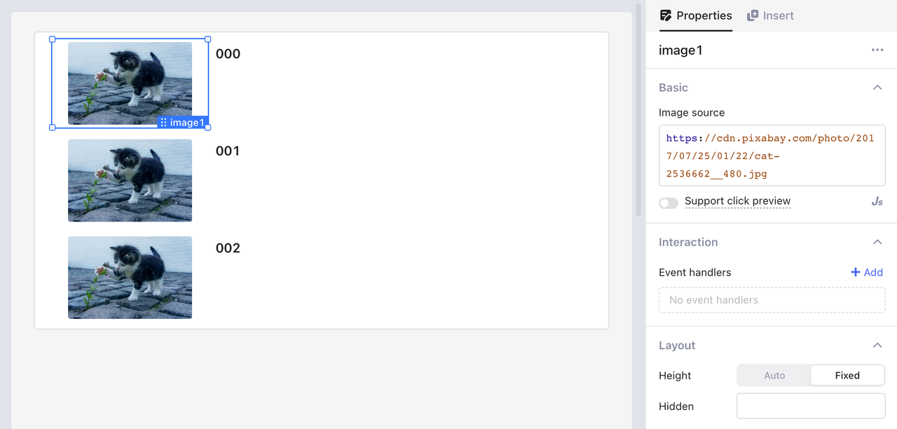 Depois de vincular dados válidos ao componente **Exibição em lista** e projetar seus componentes internos, você pode adicionar dados a esses componentes. **Exibição em lista** suporta variáveis ​​locais `currentItem` e `i`. Observe que você só precisa alterar os dados da primeira linha, e as mesmas configurações são aplicadas às outras linhas automaticamente.