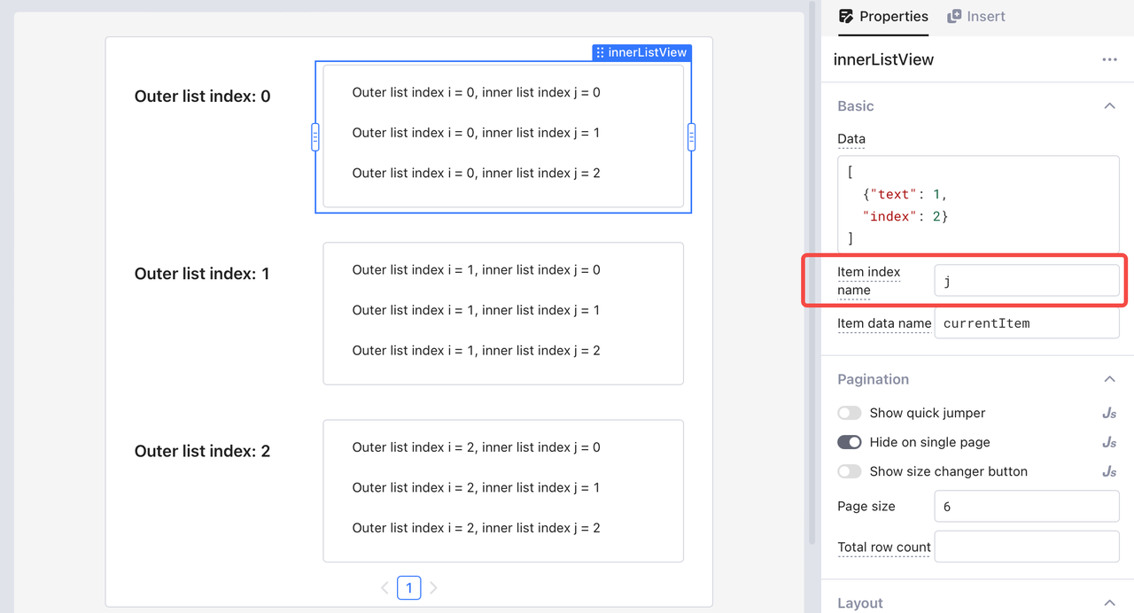 Por padrão, o índice do item é denominado `i`, referindo-se ao índice dos dados da lista e começando do zero. Além de usar `i` como números, você também pode usar `i` para acessar dinamicamente os dados dos resultados da consulta.