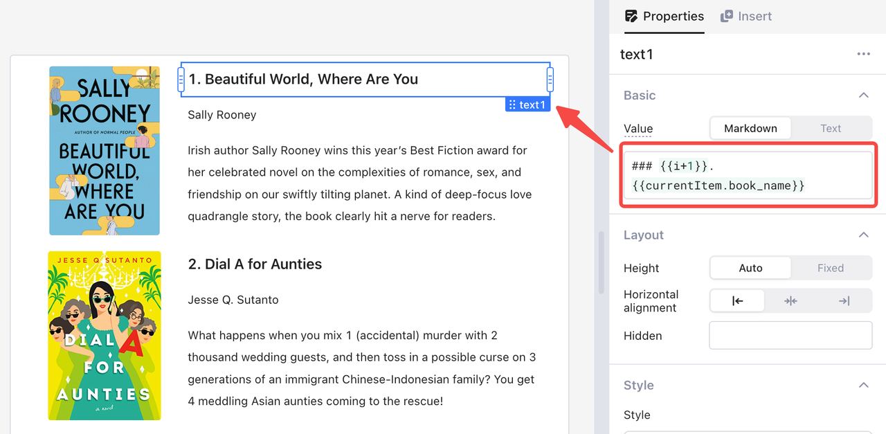 Por padrão, você pode referenciar o valor de cada item em uma lista usando a variável `currentItem`. Por exemplo, para exibir um número de série mais o nome do livro, escreva o seguinte código no valor `texto1`.