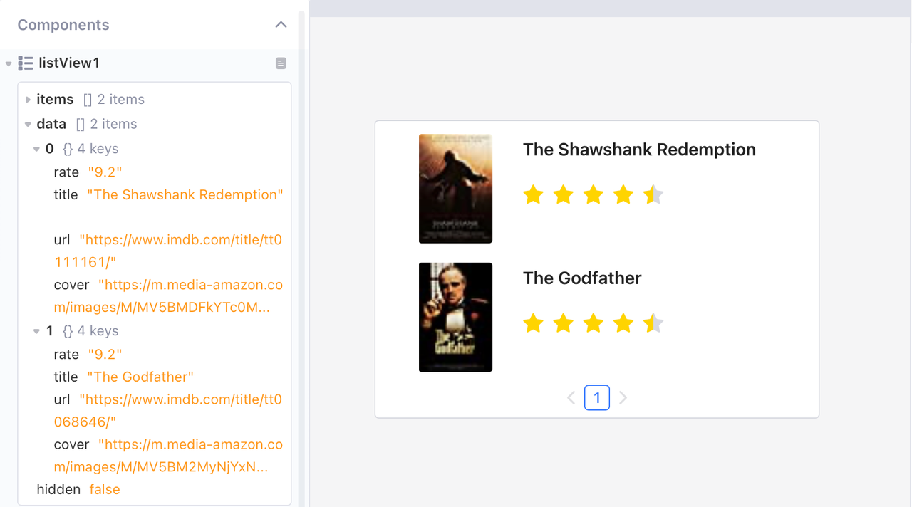 * Array: O comprimento de um array é passado como contagem de linhas e cada entrada no array é processada como um objeto JS no formato JSON, correspondendo a uma linha no componente **Exibição em lista**. Por exemplo, os dados a seguir contêm duas linhas de dados, cada uma contendo quatro campos: `avaliacao`, `titulo`, `url` e `cover`.
