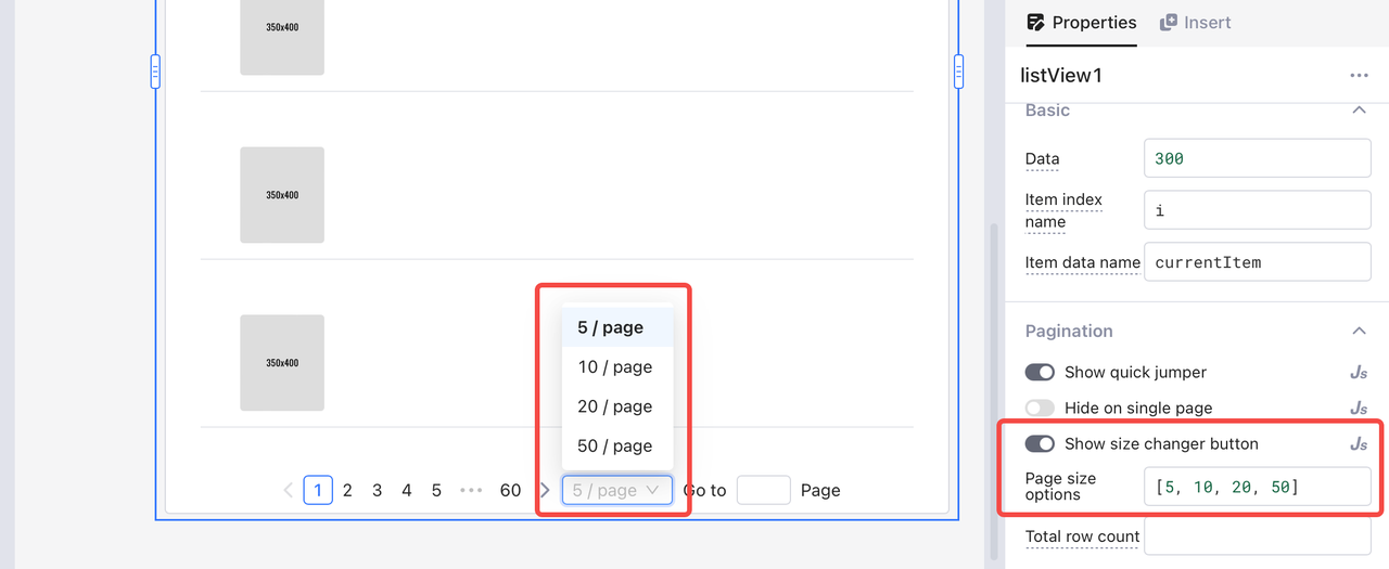 Você pode configurar se deseja permitir que seus usuários personalizem quantos itens serão exibidos em uma única página ativando ou desativando o "Mostrar botão de alteração de tamanho" ou definindo seu valor em JS. Quando desativado, você pode definir o tamanho de página padrão.