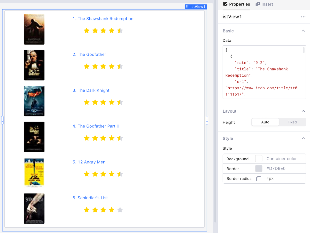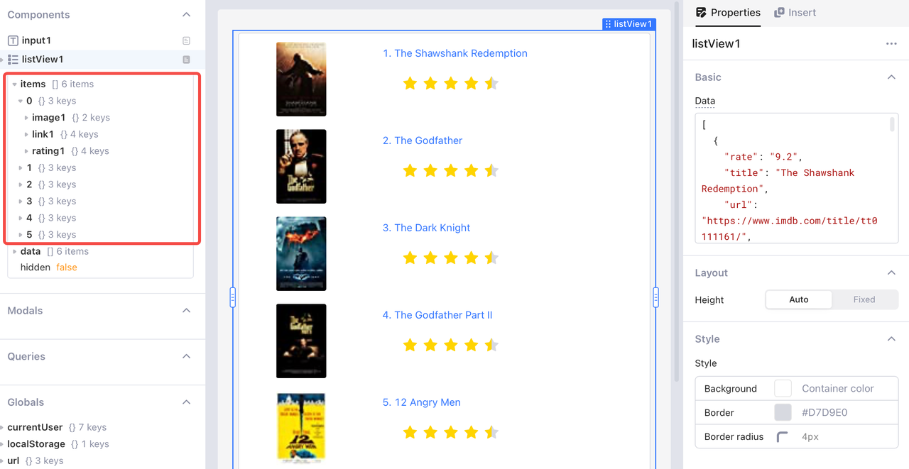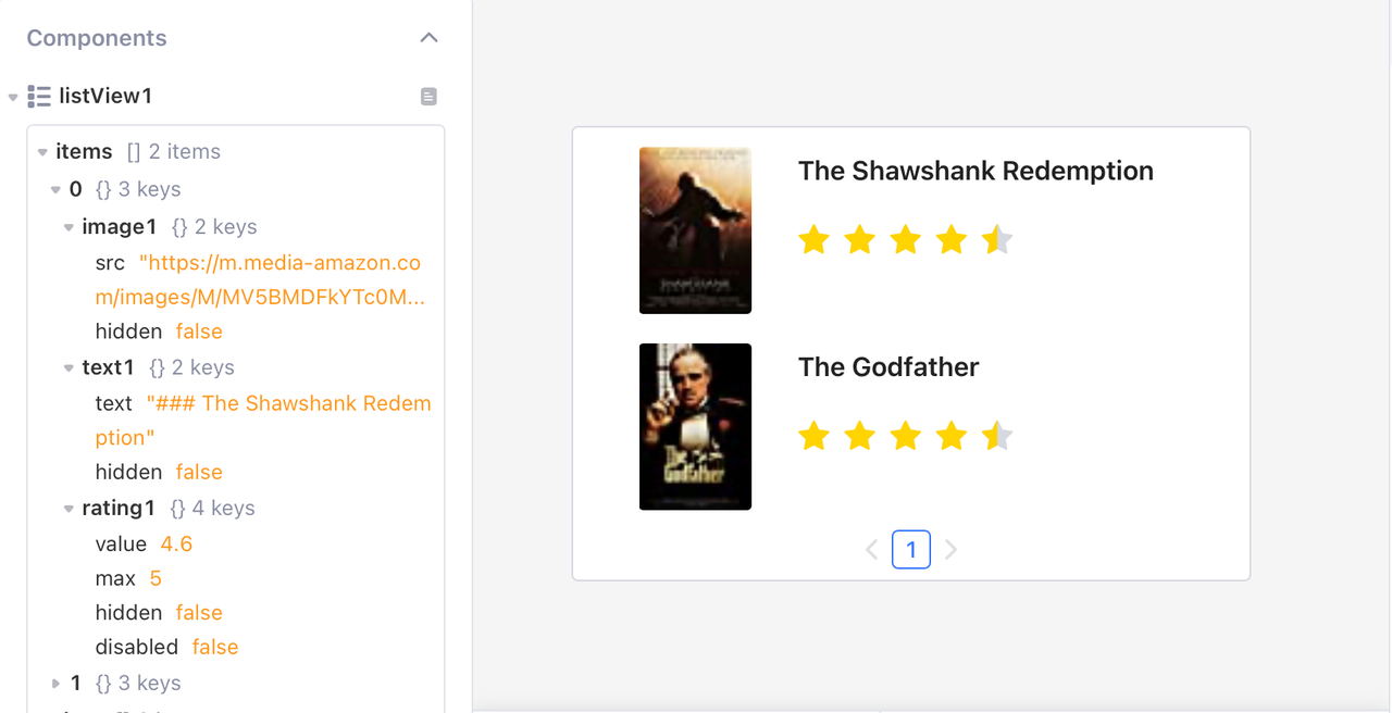 O componente **Exibição em lista** recupera dados de uma matriz JSON de objetos e exibe um componente **Imagem**, **Texto** e **Avaliação** para cada entrada. Você também pode passar os resultados da consulta para uma **Exibição em lista**.