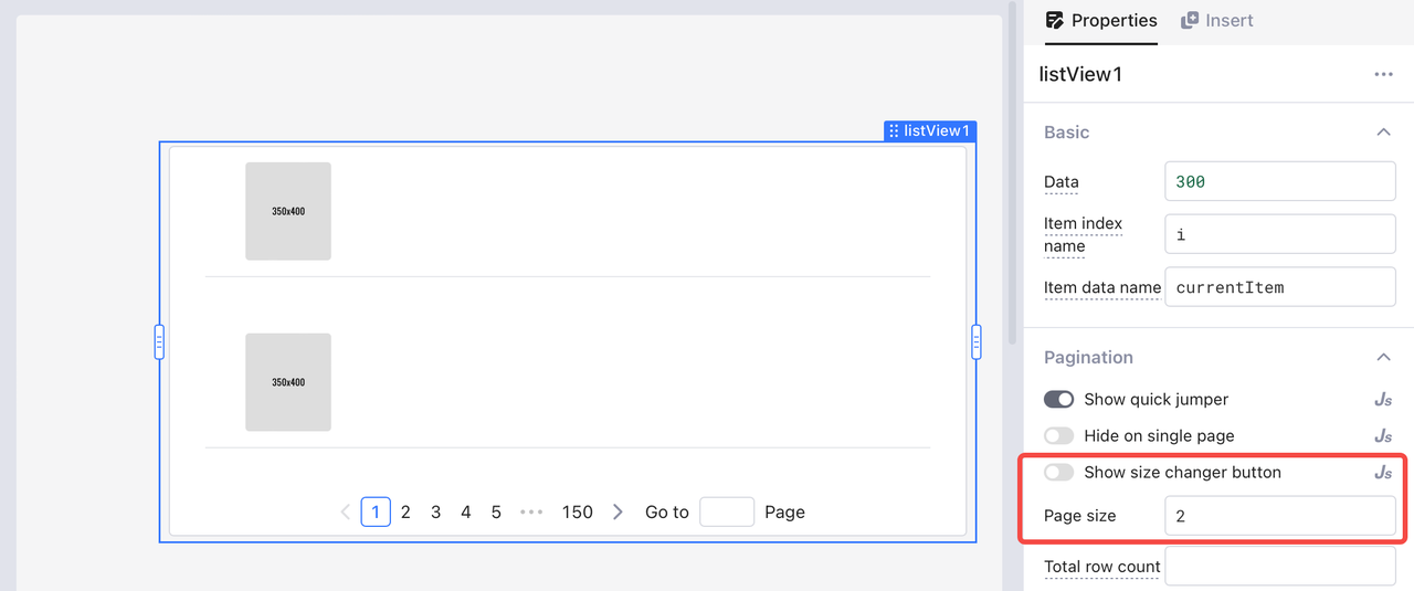 Por padrão, a contagem total de linhas de um componente **Exibição em lista** é o número de itens de dados atuais. Você também pode inserir um valor de uma consulta. Por exemplo, `{{consulta1.data[0].countador}}`.