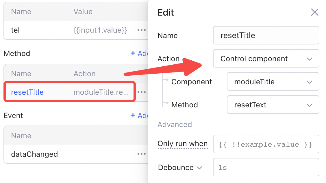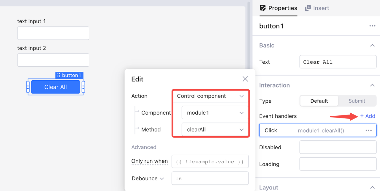 Na guia **Configurações**, clique em **+** **Adicionar** para criar um novo método de módulo. Clique no método para renomeá-lo e selecione uma ação. No exemplo a seguir, o método `limparTudo` foi projetado para limpar o conteúdo em ambas as caixas de entrada. Para conseguir isso, selecione **Executar JavaScript** como a ação e escreva o código JS para chamar o método `limparValor` de ambos os dois componentes de entrada.