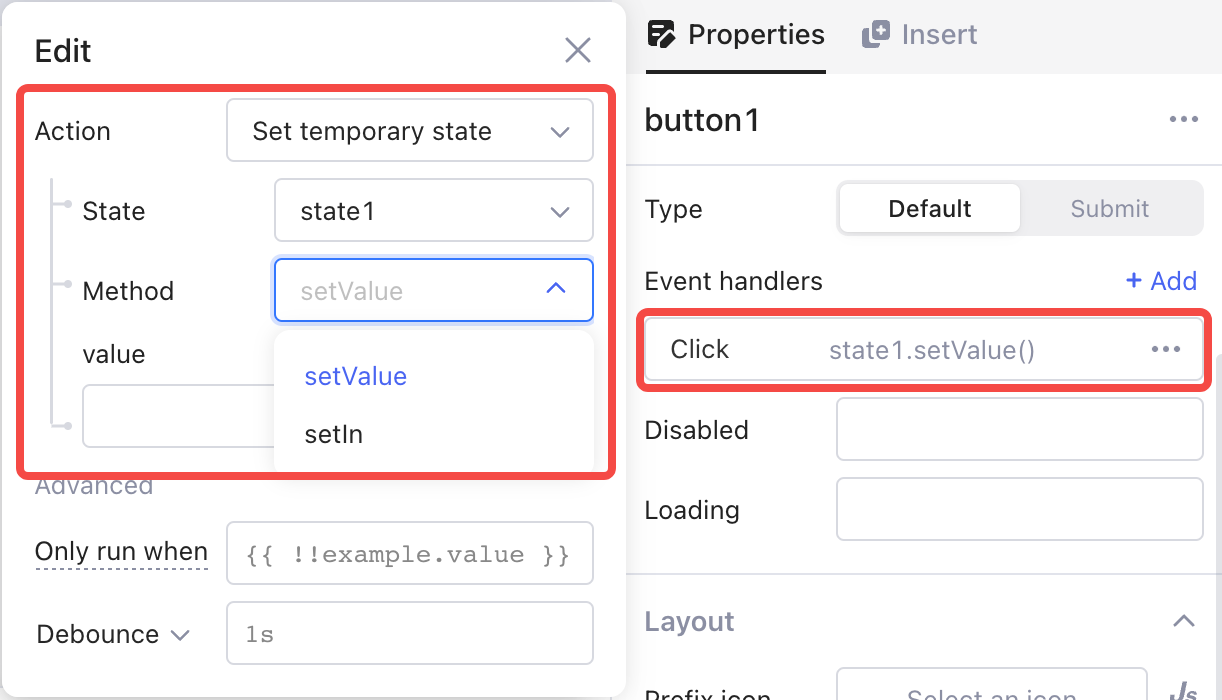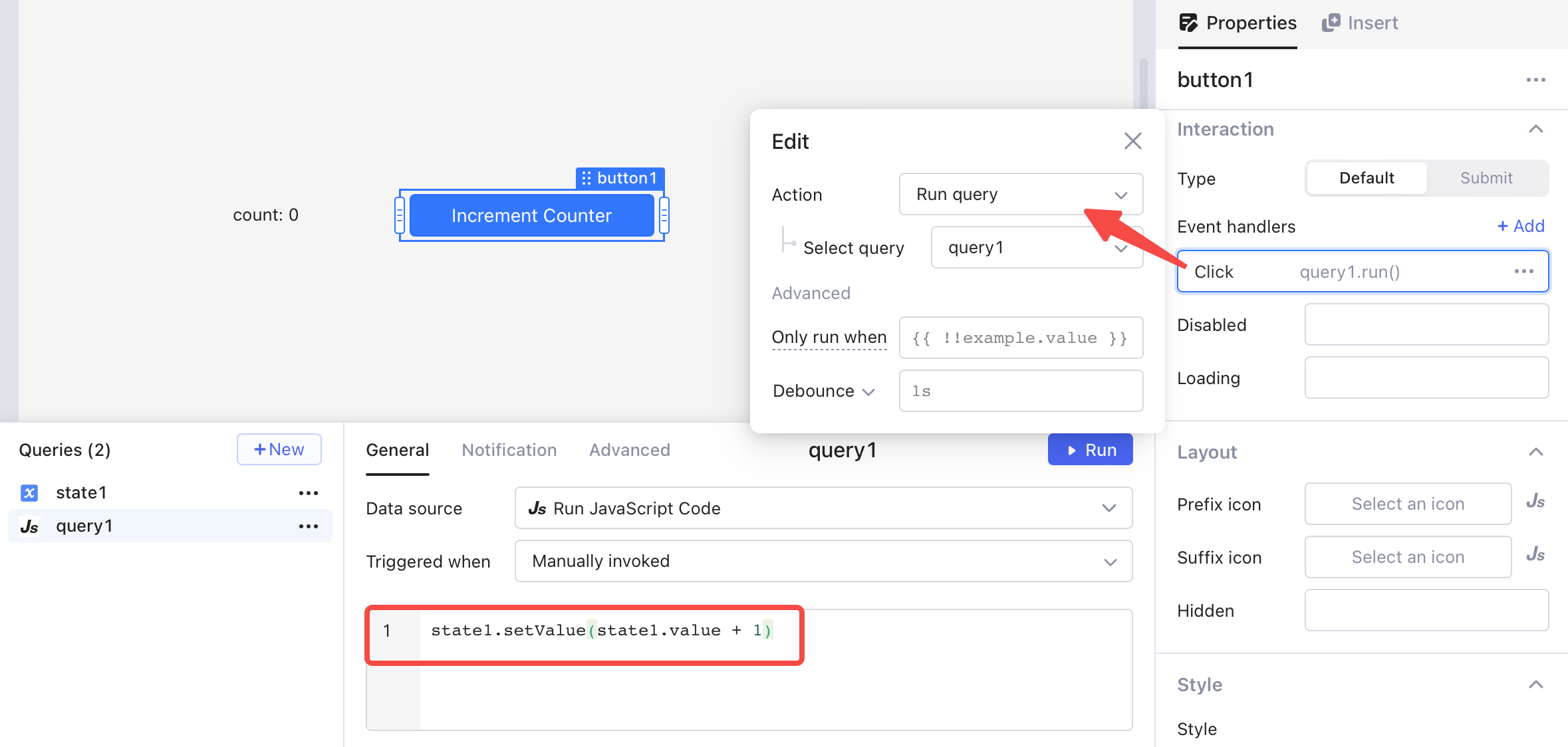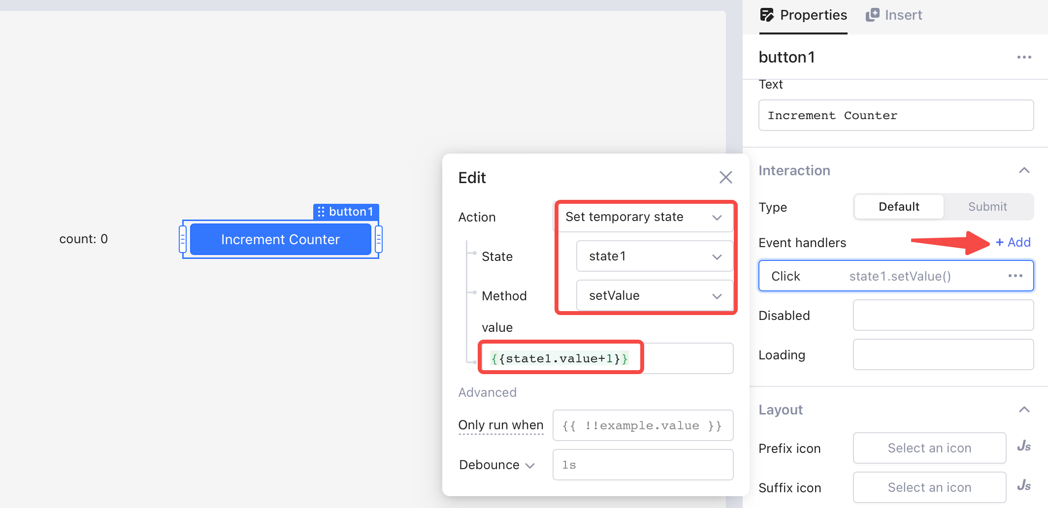 3. Adicione um manipulador de eventos para `botao1`. Selecione a ação **Definir estado temporário** e o método **setValue**, e então defina `{{estado1.value+1}}` como o valor.