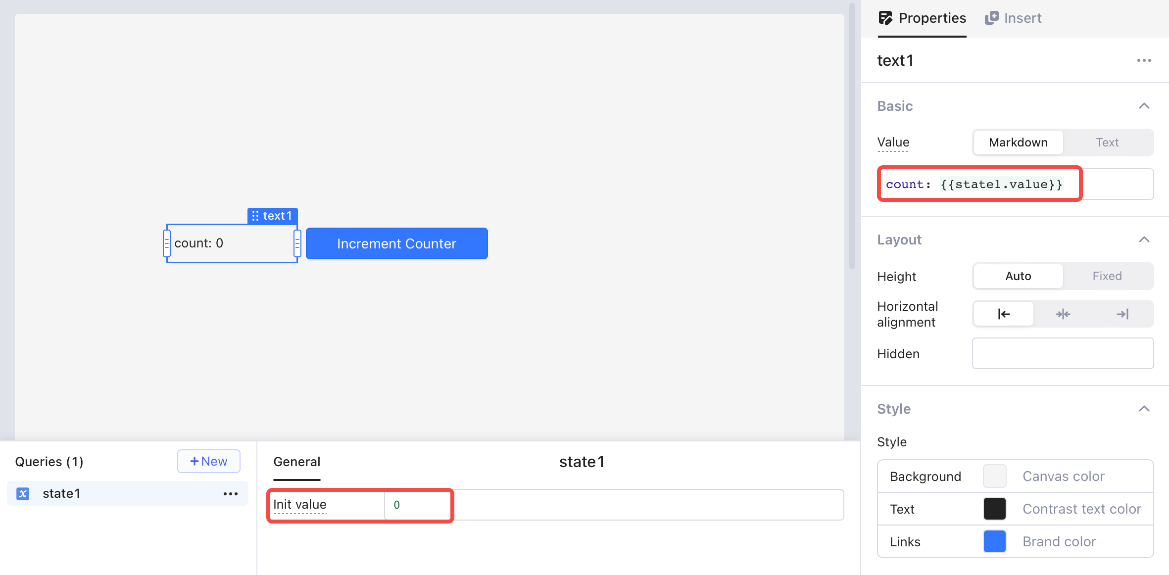 2. Crie um estado temporário `estado1`, defina seu valor inicial como `0`. Vincule `{{estado1.value}}` como o texto de exibição de `texto1`.