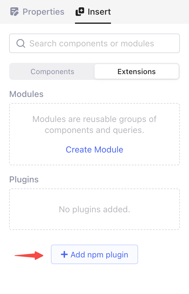 No aplicativo PocketBLocks, clique em **Inserir** > **Extensões** > **Adicionar plug-in npm** no painel direito. <img src="https://3319212993-files.gitbook.io/~/files/v0/b/gitbook-x-prod.appspot.com/o/spaces%2Fbz5pg8HuItSzRC8Qjkc6%2Fuploads%2Fgit-blob-61d836518578324db0c3851ffd1eb66a5d6bce90%2F02.png?alt=media" alt="" data-size="original">